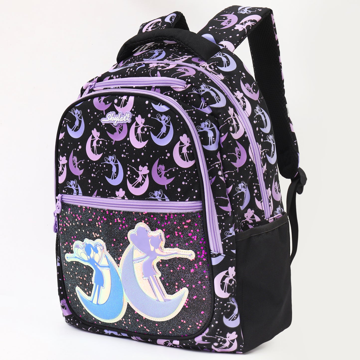 Add a touch of magic to school days with the Skylar Moonlight Fairy Backpack. With shimmering holographic accents, a beautiful moon-and-fairy theme, and a spacious multi-pocket design, this backpack blends fantasy charm with everyday practicality—perfect for young dreamers.