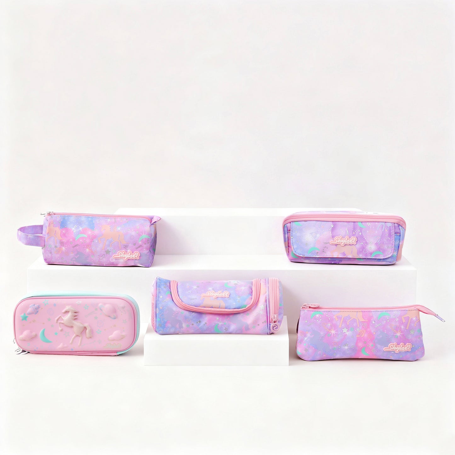 Bring magic to every school day with the Skylar Unicorn Hard-Shell Pencil Case, designed for kids who love sparkle, colour, and imagination. Made with a durable molded EVA hard cover, this case offers reliable protection for stationery while showcasing an enchanting unicorn design set in a dreamy pastel galaxy of stars, planets, and clouds.