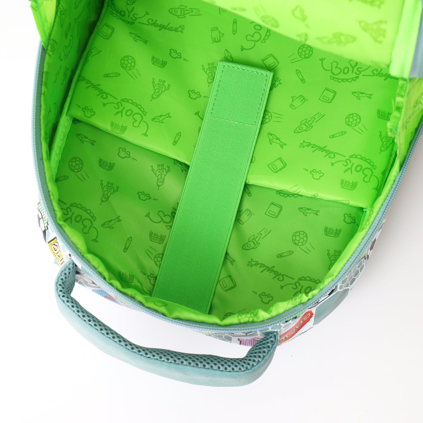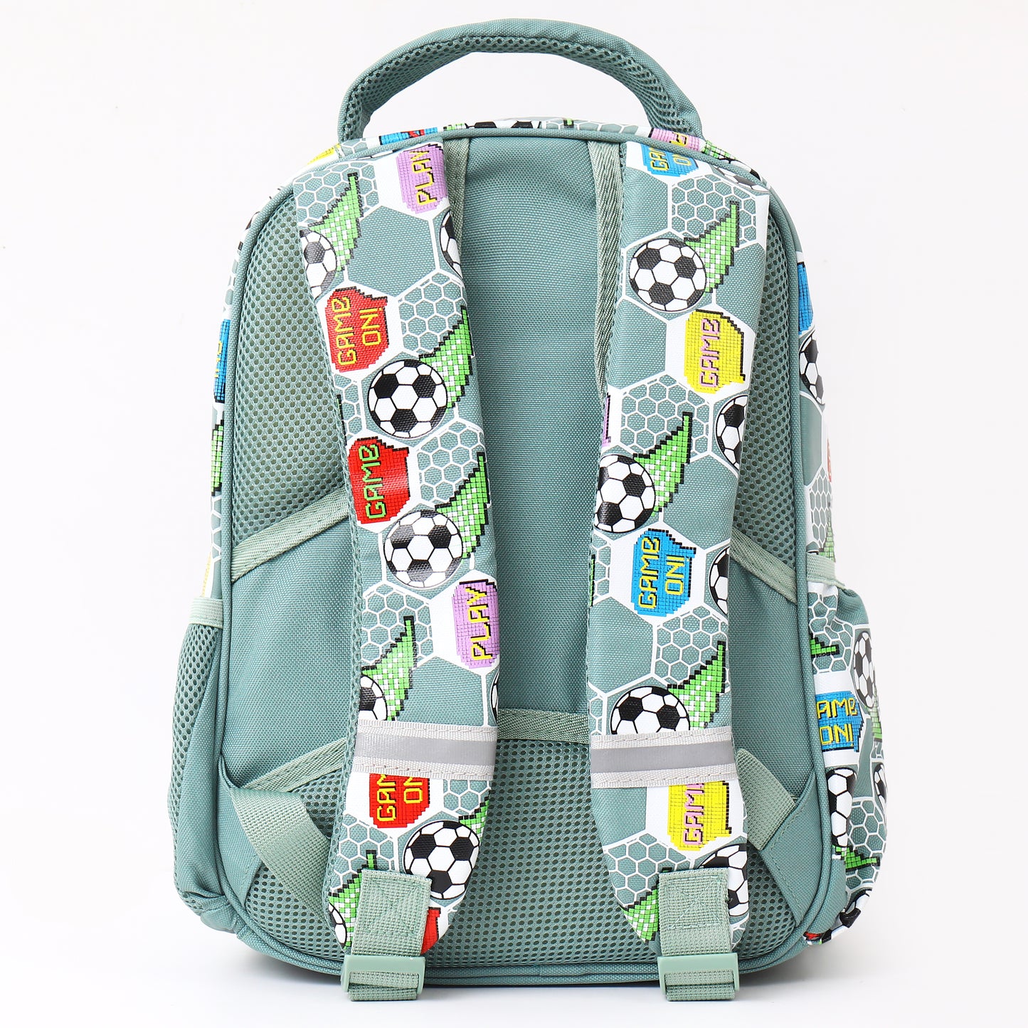 - Wide, soft shoulder straps with fun soccer print