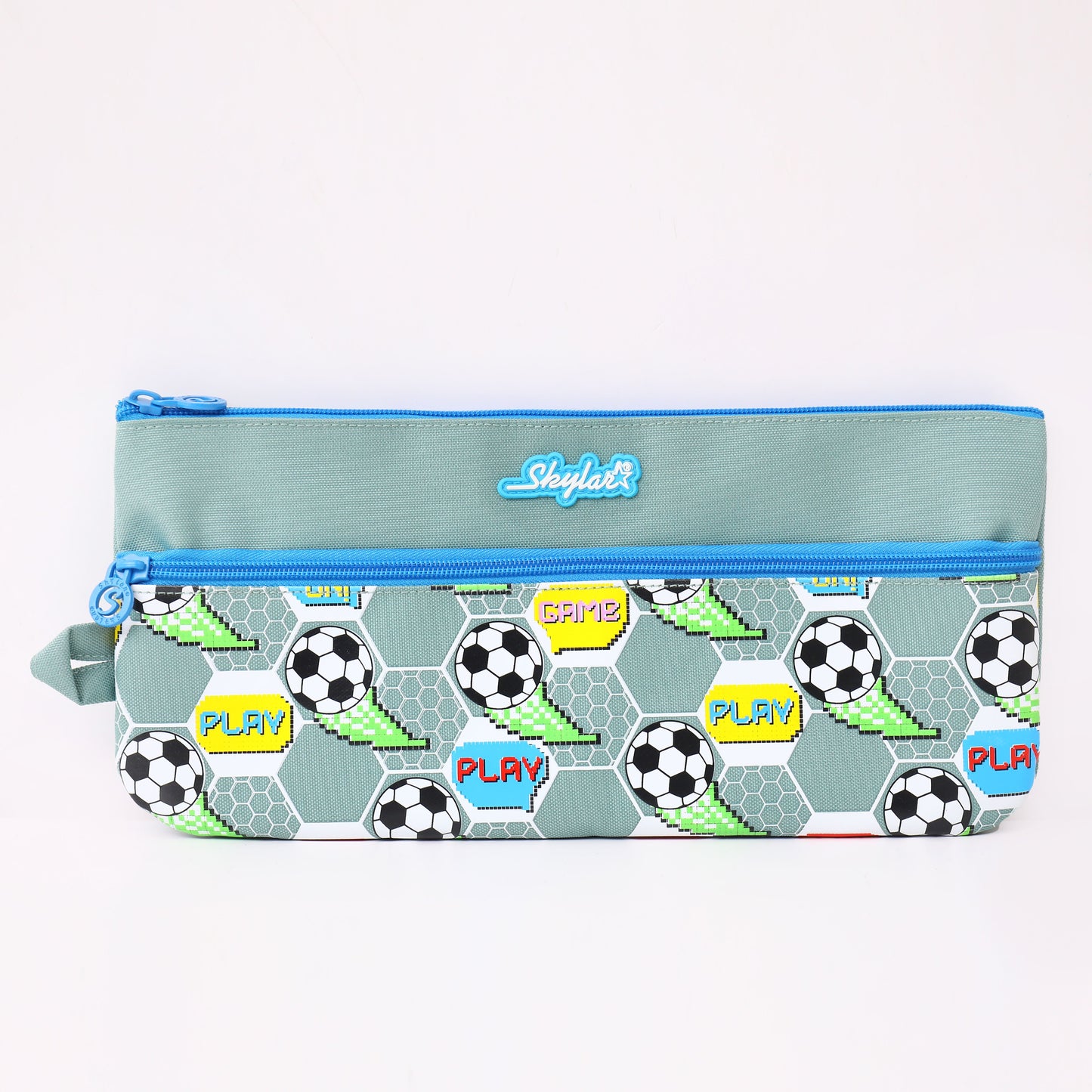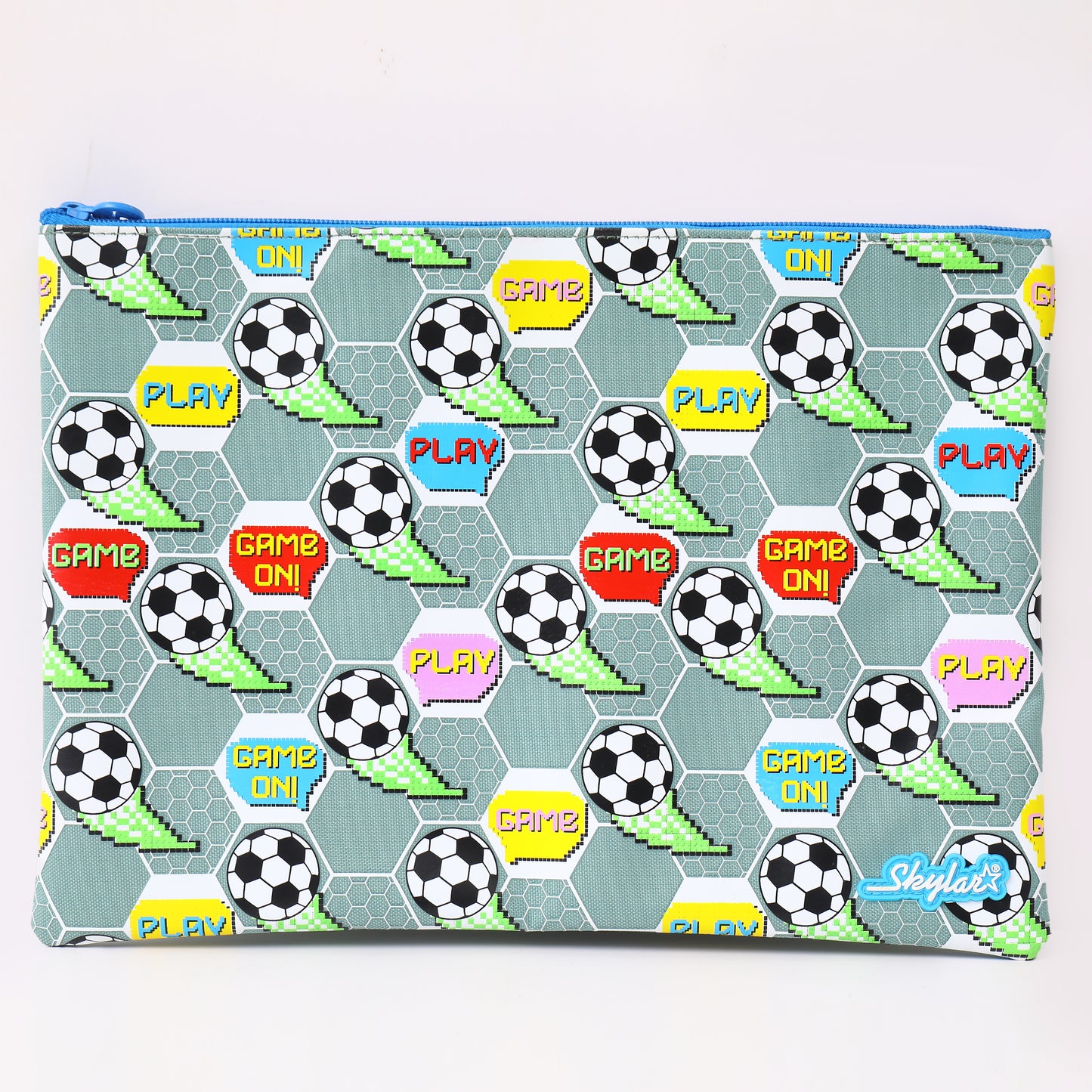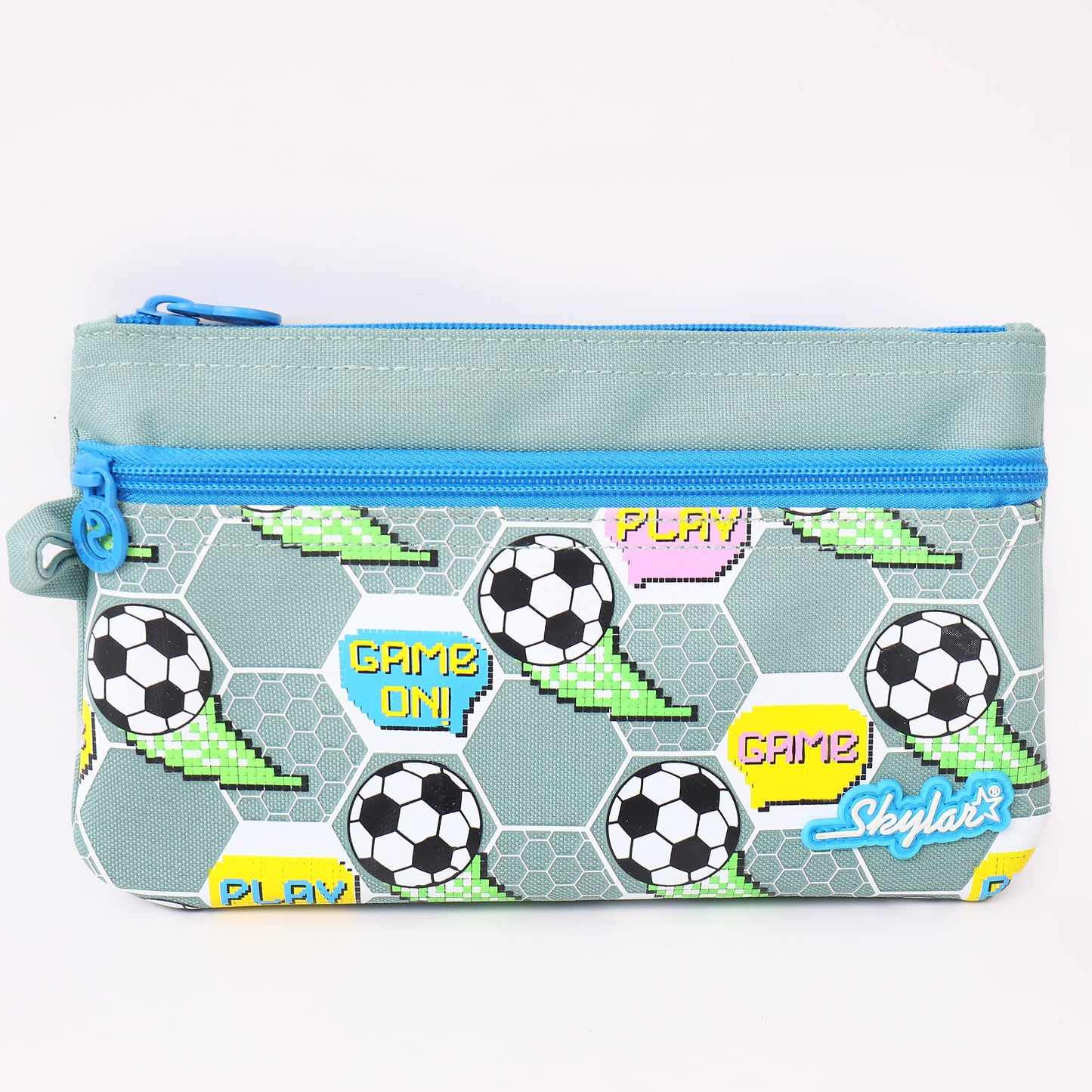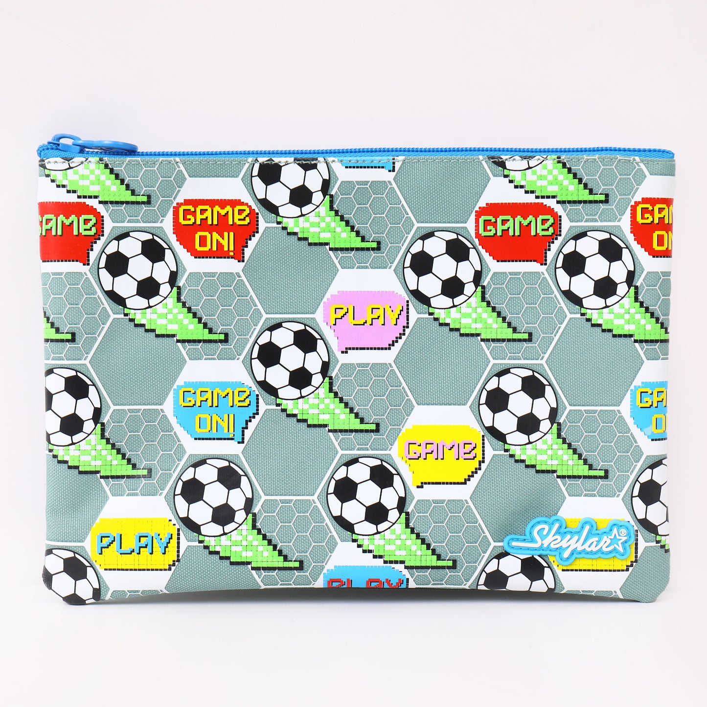 Meet the Skylar Game On Multi-Purpose Pouch - Soccer – Pixel Edition, designed for boys who love football and bright colours! This multipurpose pouch keeps school essentials neat and easy to find. With three separate zip compartments, kids can sort books, worksheets, rulers, pencils, and small items without mixing everything together.