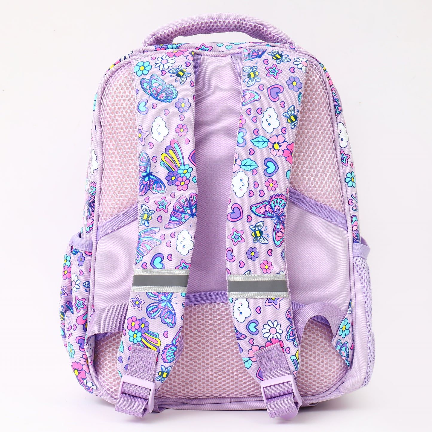 - The backpack is covered in a beautiful all-over print featuring butterflies, flowers, little rainbows, stars, and heart icons—perfect for kids who love colourful and playful designs.