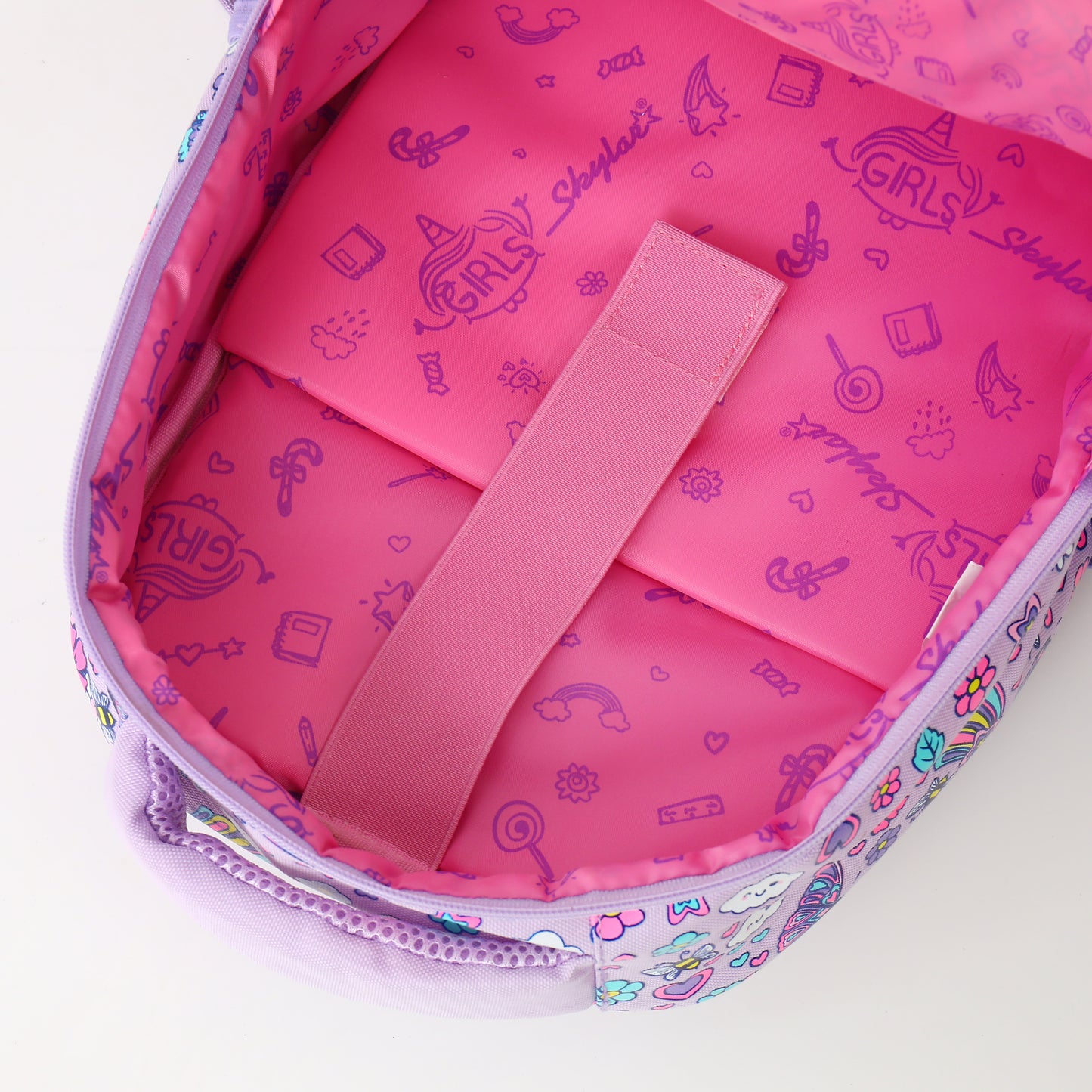 Bright, cheerful, and full of magical detail—this Skylar backpack is designed to delight young adventurers. Decorated with colourful butterflies, flowers, rainbows, and hearts, this lavender-toned backpack brings joy to every school day while offering practical functionality for daily use.